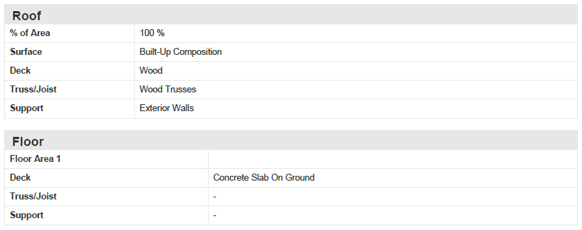 Roof and Floor Systems: Surface, deck, truss/joist type, and support materials (concrete slab construction in this case).