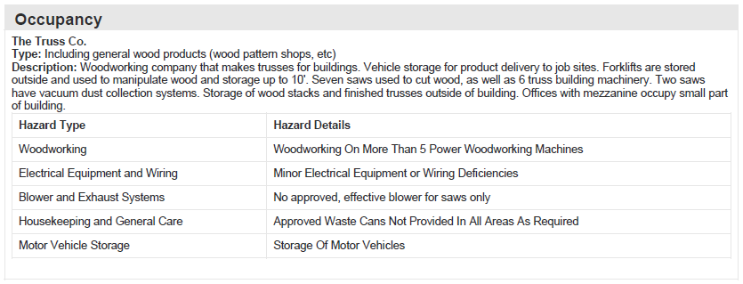Let’s take a closer look at each section, using the report for The Truss Co. (Risk No. 221922) as an example.