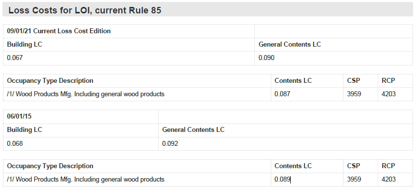 For The Truss Co., the report includes data from both the current and prior Rule 85 filings, showing how loss costs have evolved over time. The occupancy type, Wood Products Manufacturing (including general wood products), carries naturally higher risk factors due to combustible materials and continuous production activity.